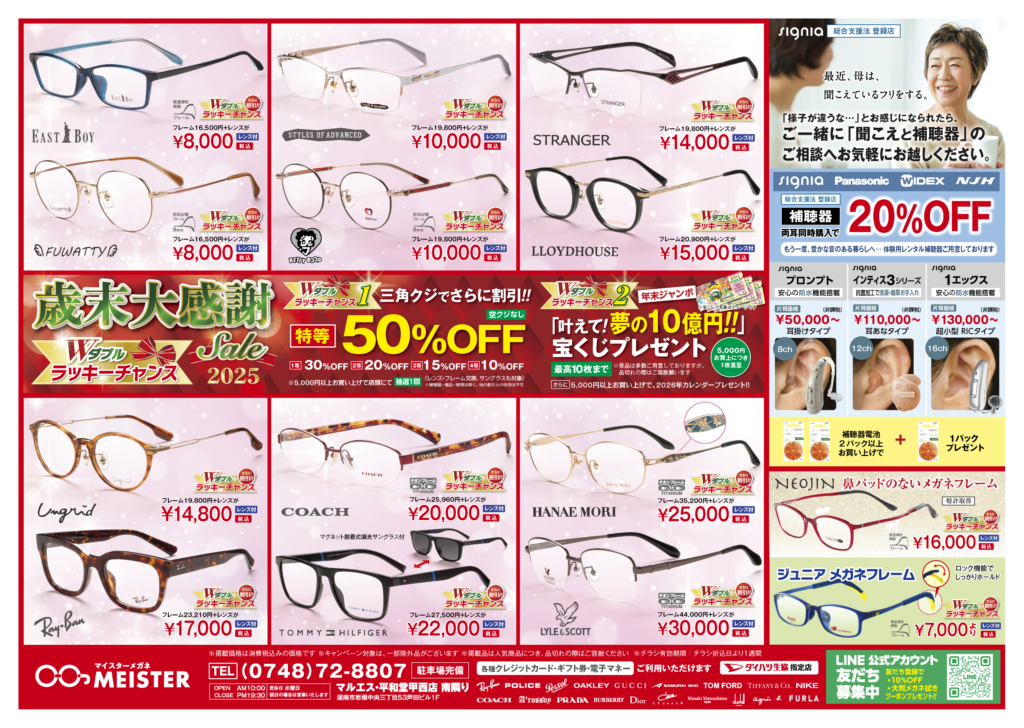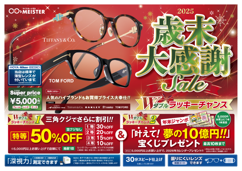 ここしばらく値上げのニュースばかりですが、新年を新しいメガネで迎えていただく為に、また一攫千金の夢を掴むために、マイスターメガネでは 2025歳末大感謝セールとして、今年もWラッキーチャンスキャンペーンを実施いたします